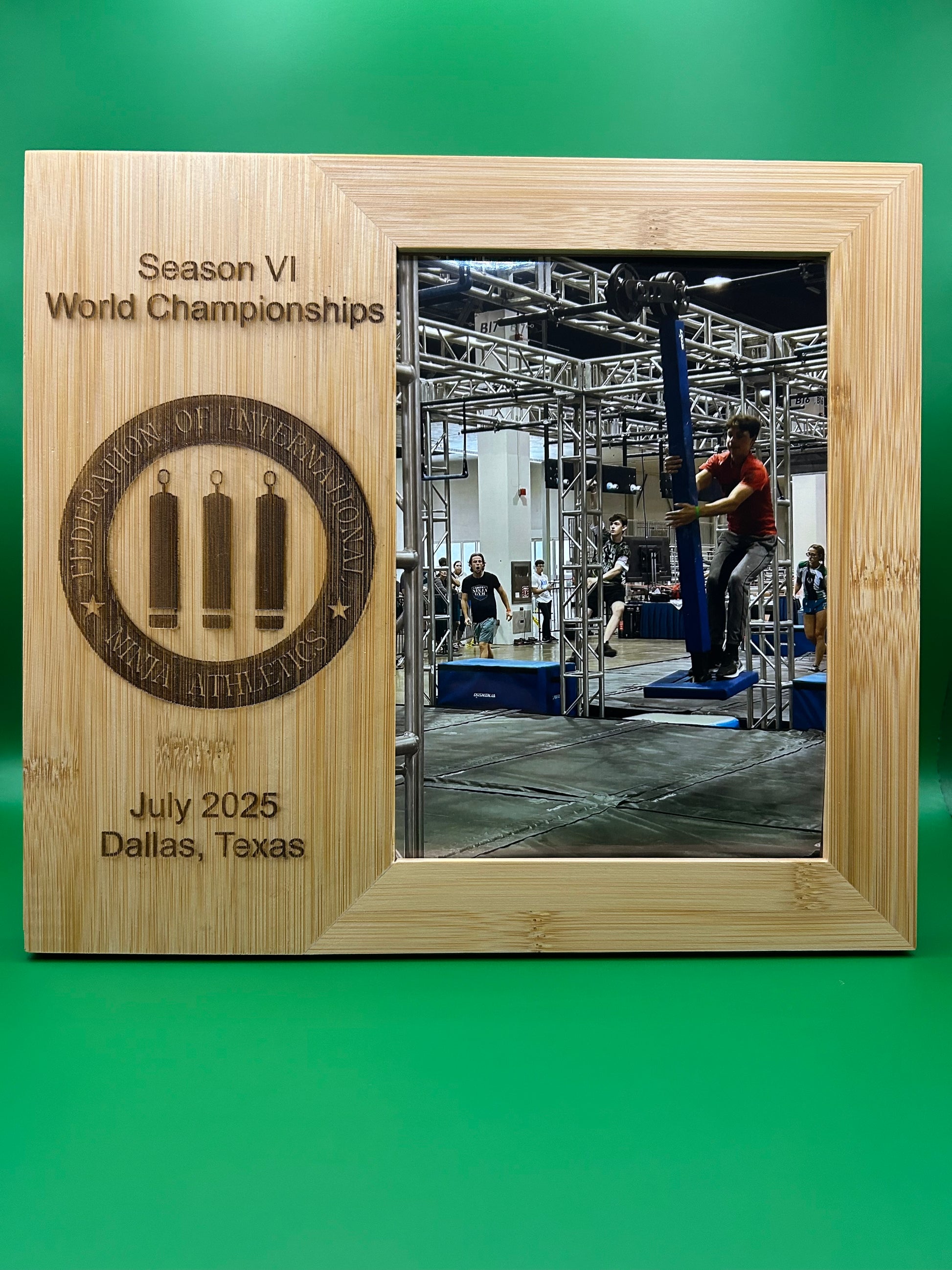 This bamboo frame holds a 5x7 vertical photo. The full size of the frame is 9"x 10" This frame is engraved with the official FINA circular badge.